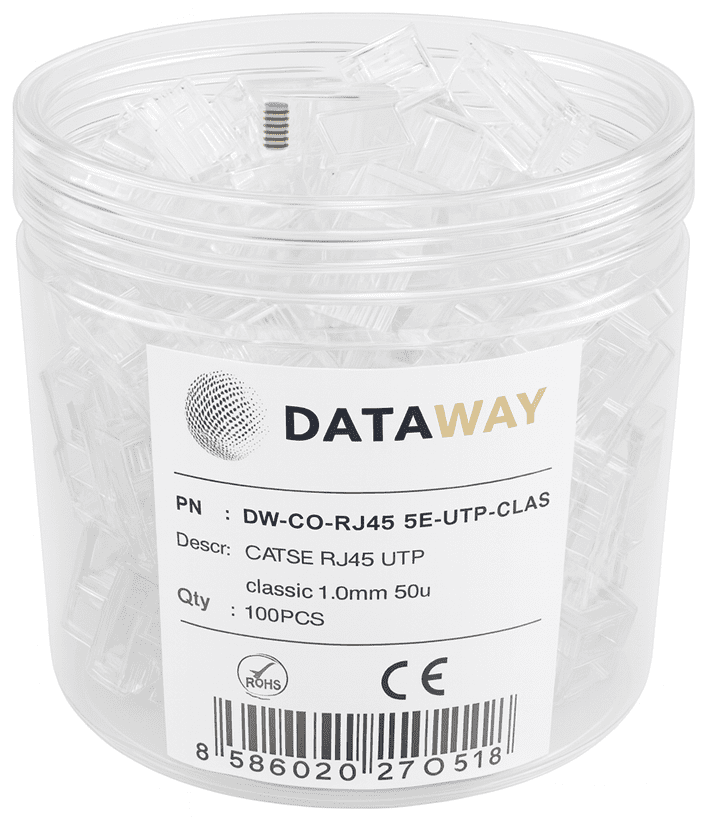 Konektory DATAWAY RJ45 CAT5E UTP sú určené na zakončenie sieťových káblov typu drôt (solid) pri tvorbe štruktúrovanej kabeláže. Ide o klasické, transparentné konektory so štandardným rozložením pinov, vhodné pre použitie v domácich aj firemných sieťach.