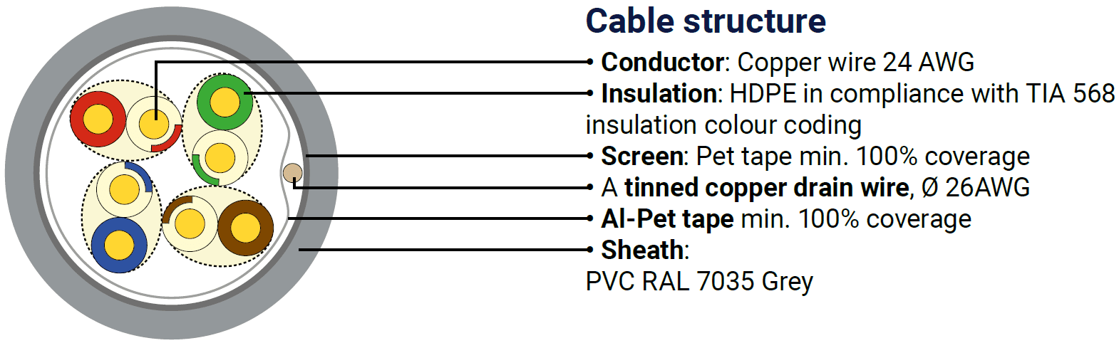 Kvalitné sieťové tienené káble DATAWAY podporujúce protokoly 1000Base-T kategórie CAT5E, s podporou šírky pásma až 100 MHz.