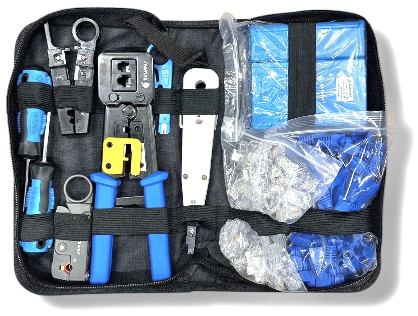 Sada náradia obsahujúca okrem kvalitných krimpovacích klieští DATAWAY, ktoré sú určené na krimpovanie RJ45 EASY konektorov DATAWAY, aj tester RJ45káblov, orezávače káblov, KRONE/110 nástroj a veľa ďalšieho.