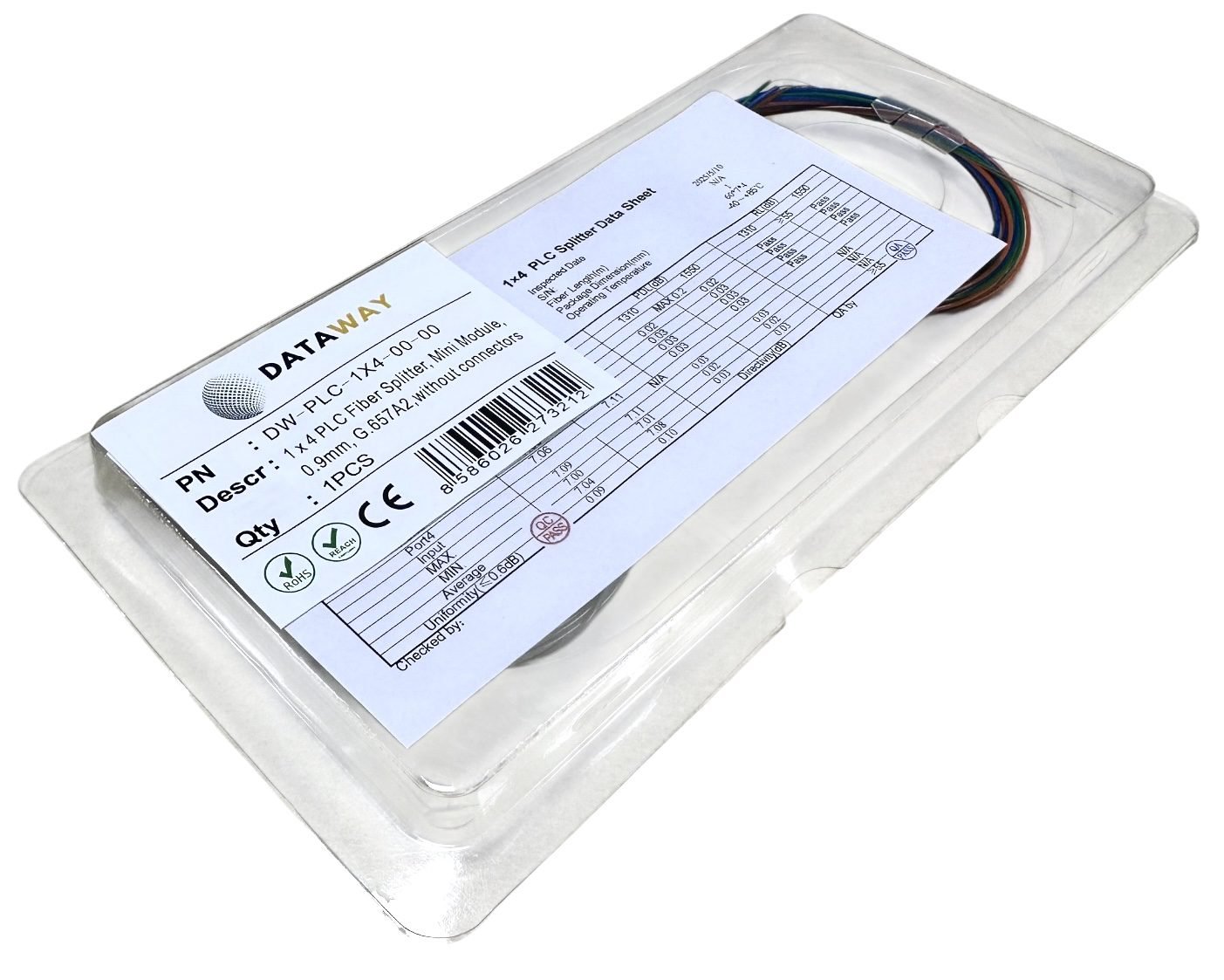 Optický splitter DATAWAY PLC 1×4 v kompaktnom MINI modulovom prevedení slúži na presné a rovnomerné rozdelenie optického signálu z jedného vstupného vlákna na štyri výstupy. Použitá PLC technológia (Planar Lightwave Circuit) zaručuje nízky útlm, stabilný výkon a vysokú presnosť rozdelenia v celom pásme vlnových dĺžok 1260–1650 nm.